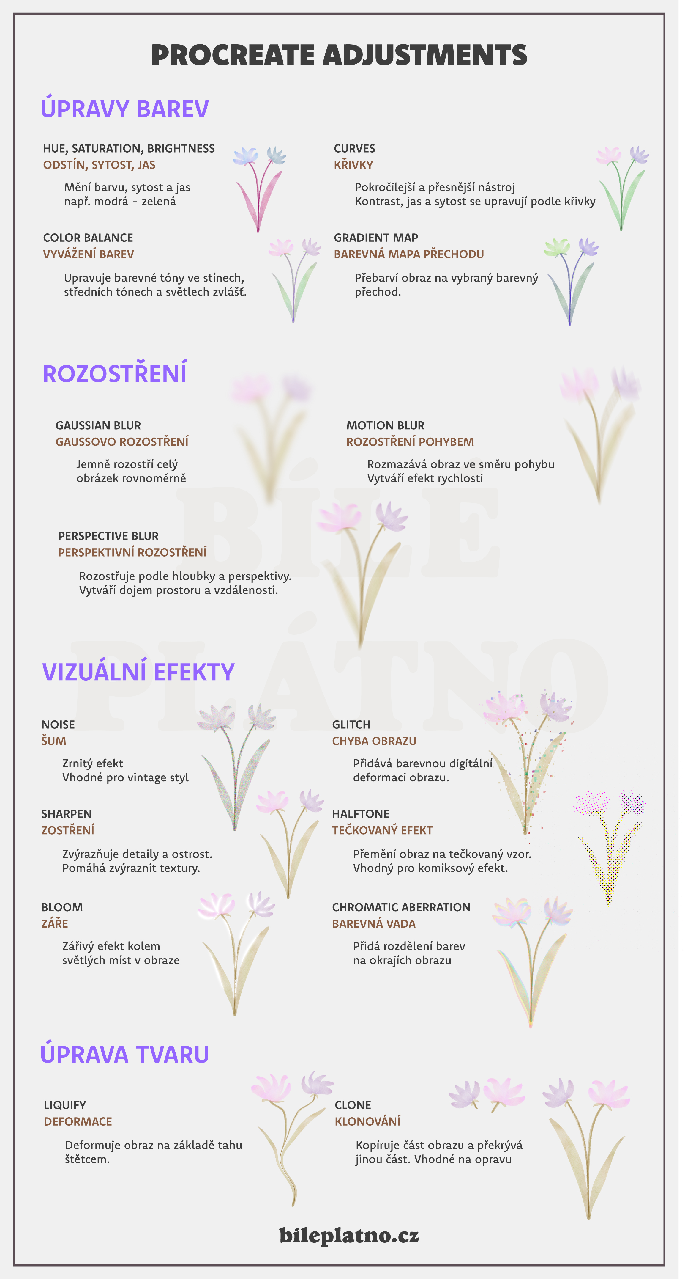 Níže najdete přehled úprav v Procreate, který jsem zpracovala do jednoduché infografiky. Úpravy jsou rozděleny do několika skupin podle typu vizuální změny, od úpravy barev přes rozostření až po změny tvaru. Většinu z nich můžete aplikovat buď na celou vrstvu, nebo pomocí funkce výběru (třetí ikona zleva nahoře) pouze na vybranou část vrstvy.